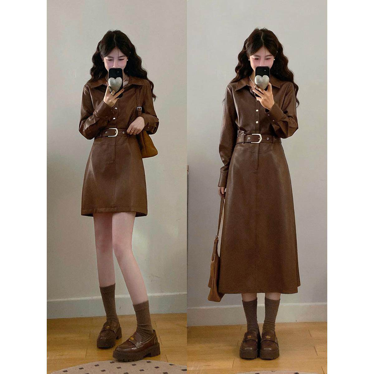 实拍~大码女装布鲁克林棕咖色皮衣连衣裙胖MM藏肉显瘦收腰皮裙女