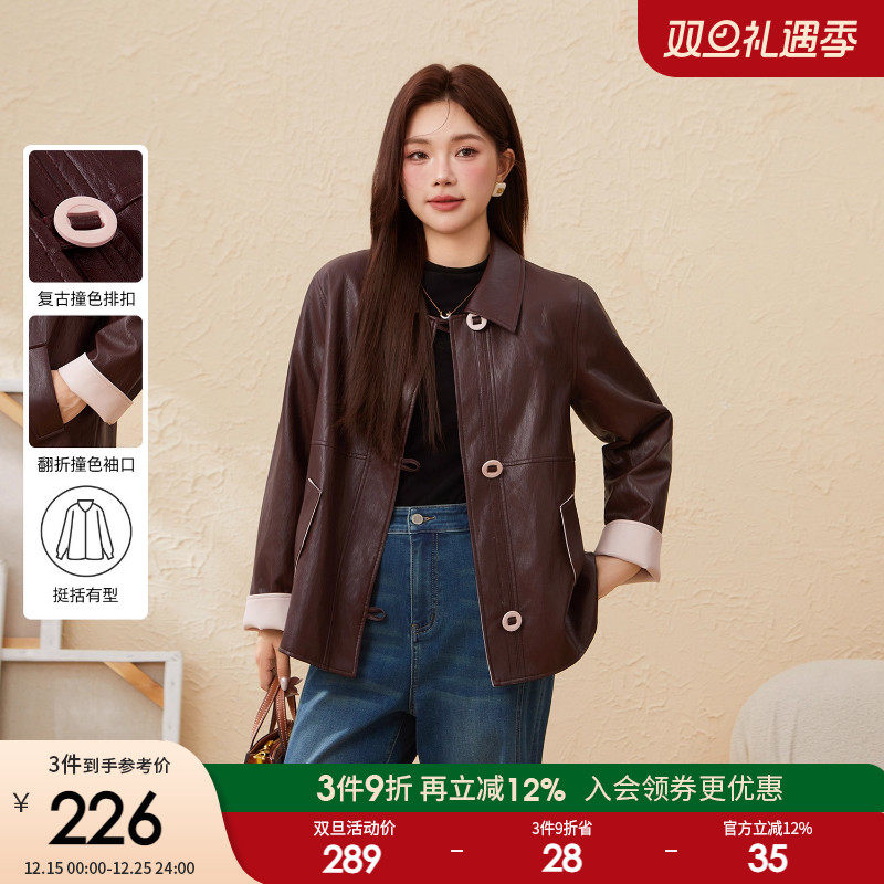 采多宝大码女装胖mm2025冬季新款撞色拼接pu夹克皮衣外套EDW6007