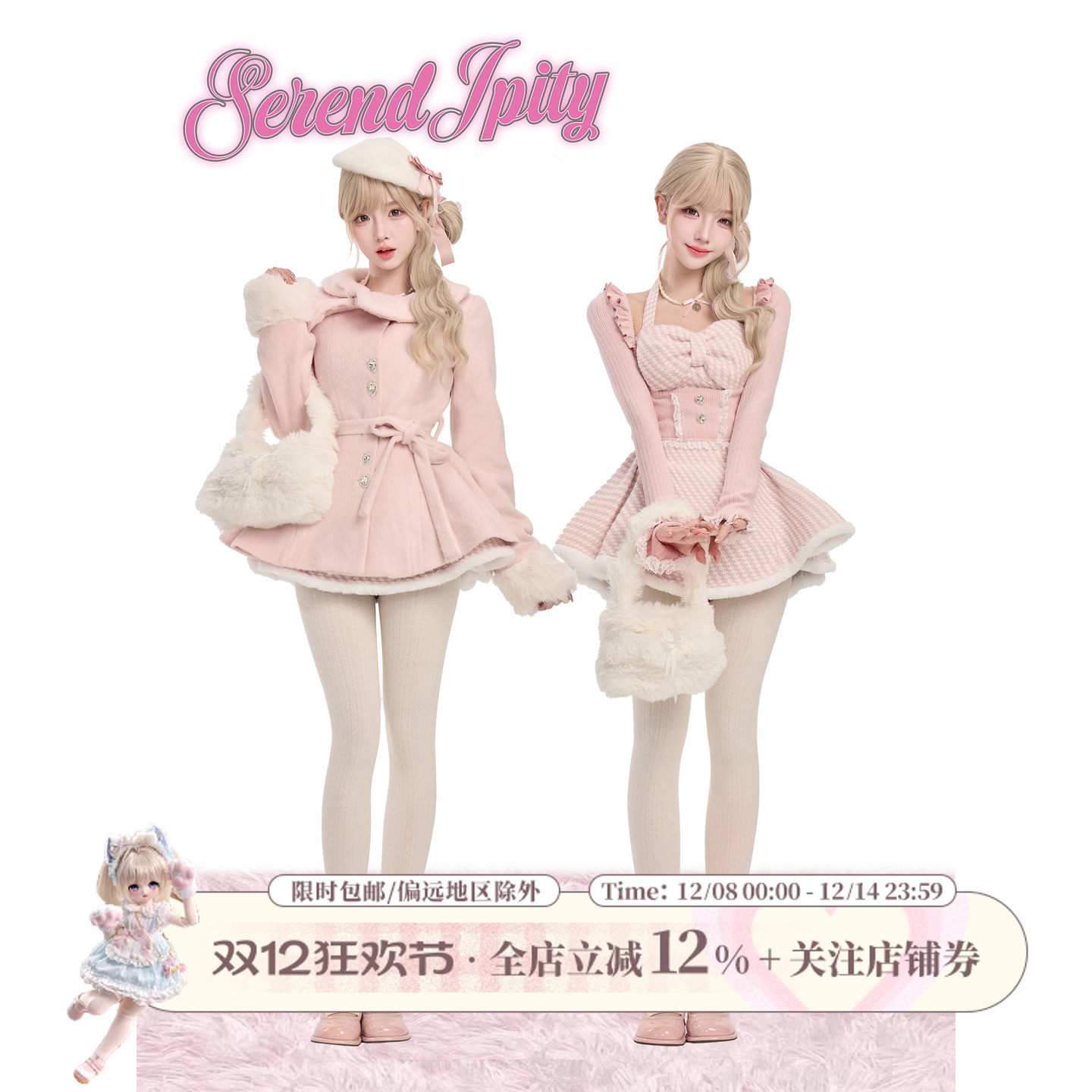 少女椰子【千金系】绒粉千金冬季针织开衫+千鸟格裙+毛呢外套套装