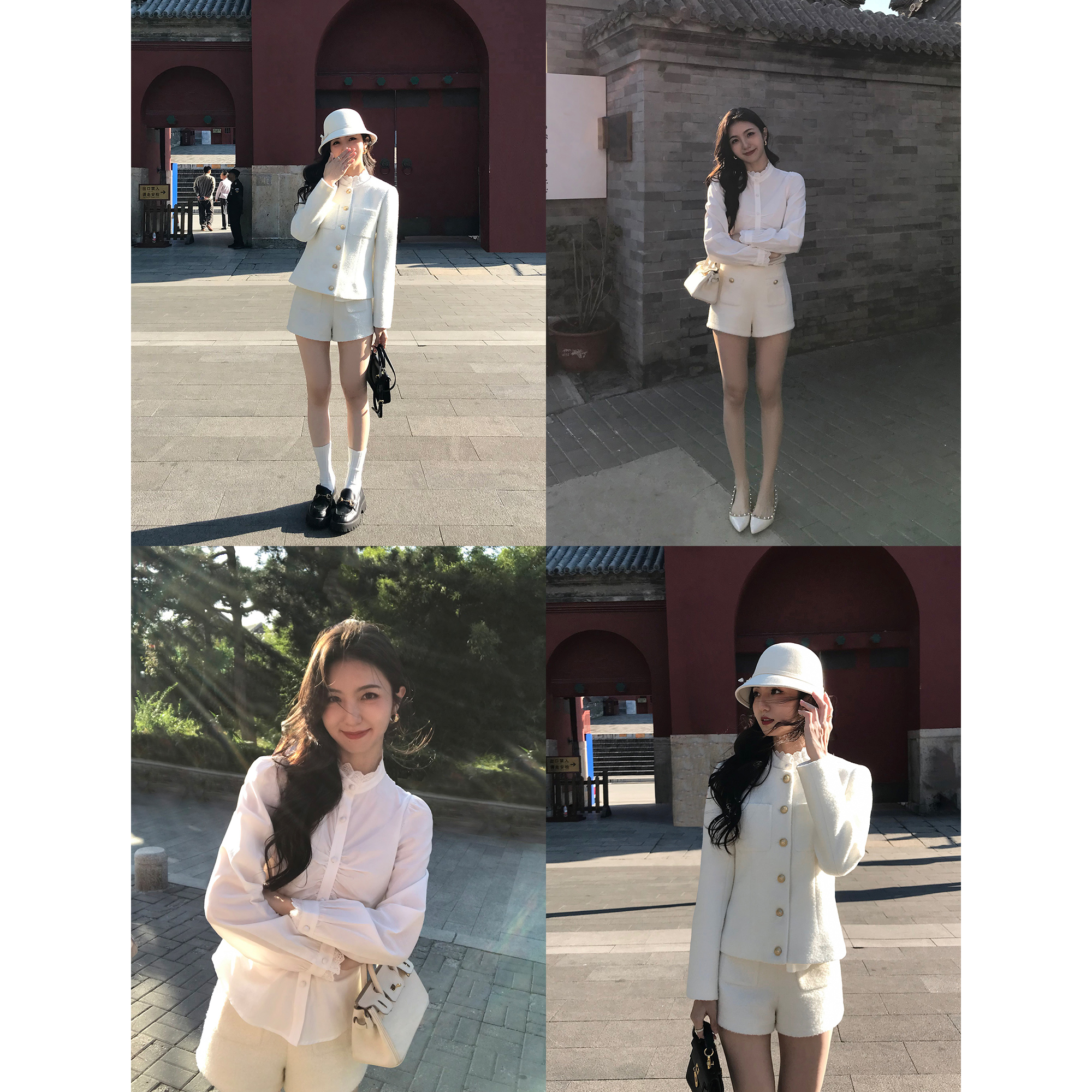 MULVAN【现货7折】小香风白色毛呢外套女高级感气质a字短裤套装