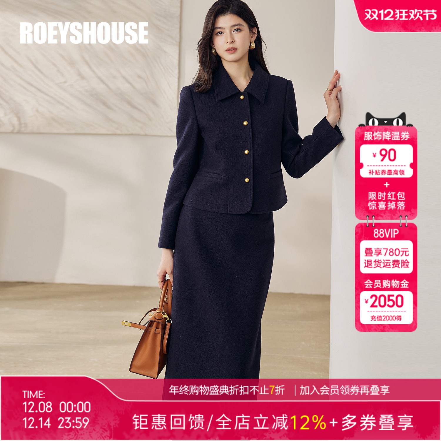 罗衣高级深蓝色毛呢套装女秋冬通勤短西装外套半身裙两件套13069
