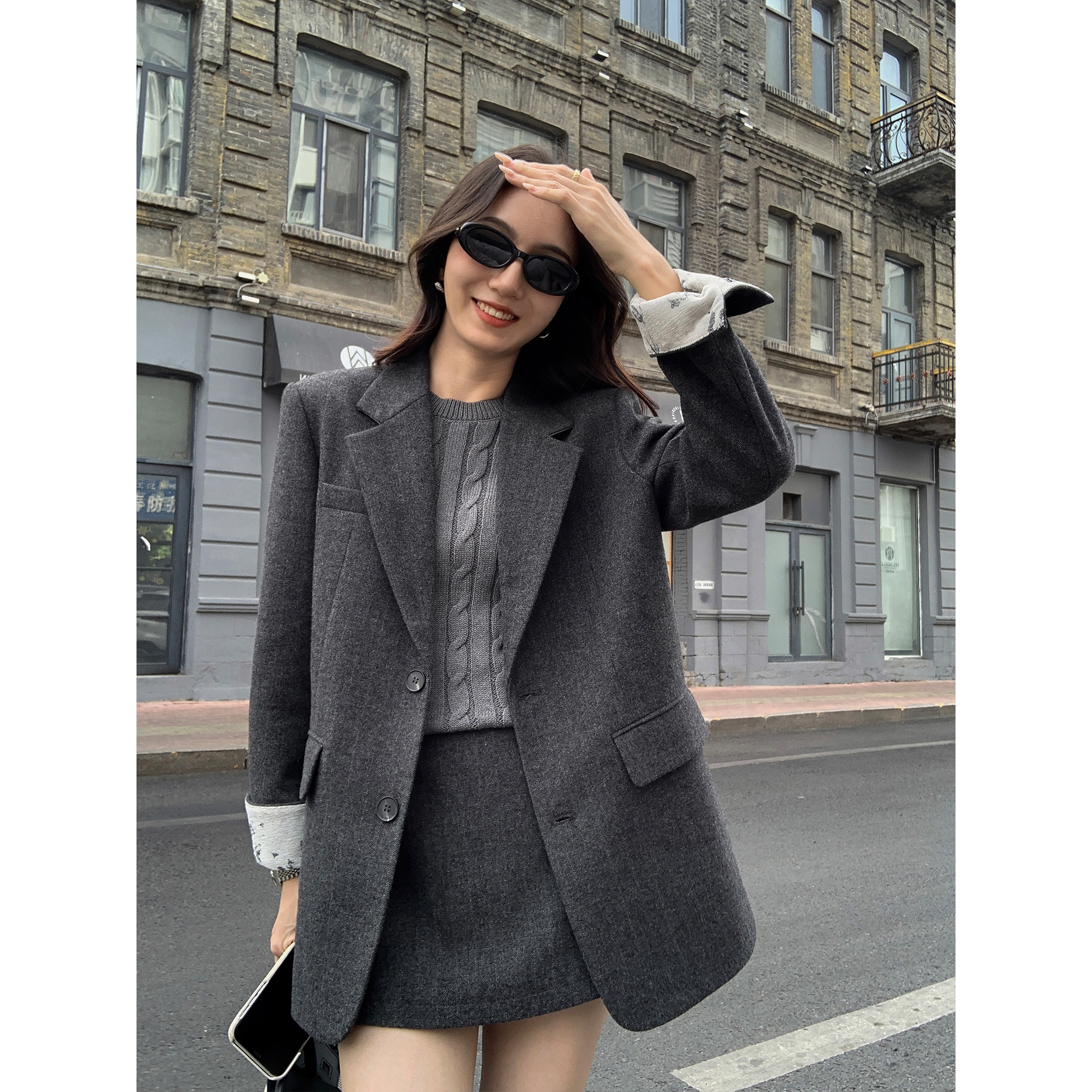 学院风毛呢套装女秋冬灰色西装外套半身裙两件套小个子高级感气质