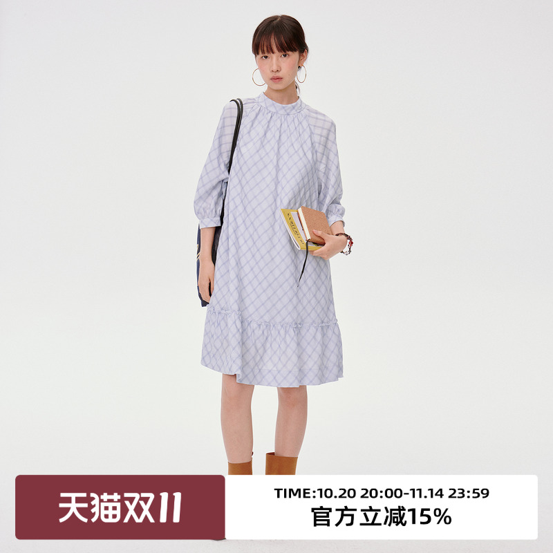 omont蛋挞家气质立领格纹宽松长袖连衣裙2025秋季显瘦设计感中裙