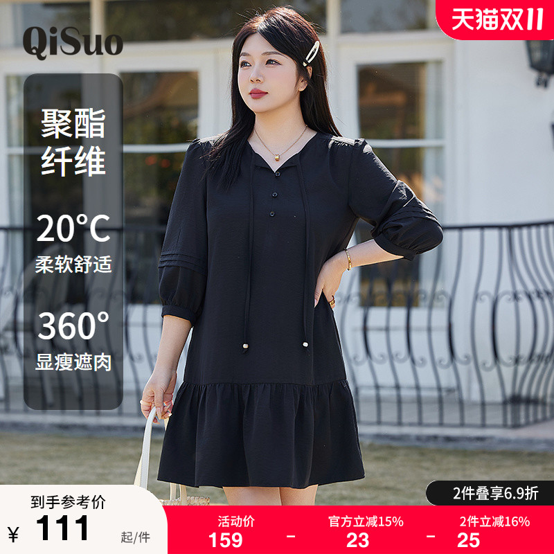绮娑黑色连衣裙女秋装2025新款高级感显瘦大码胖MM气质七分袖中裙