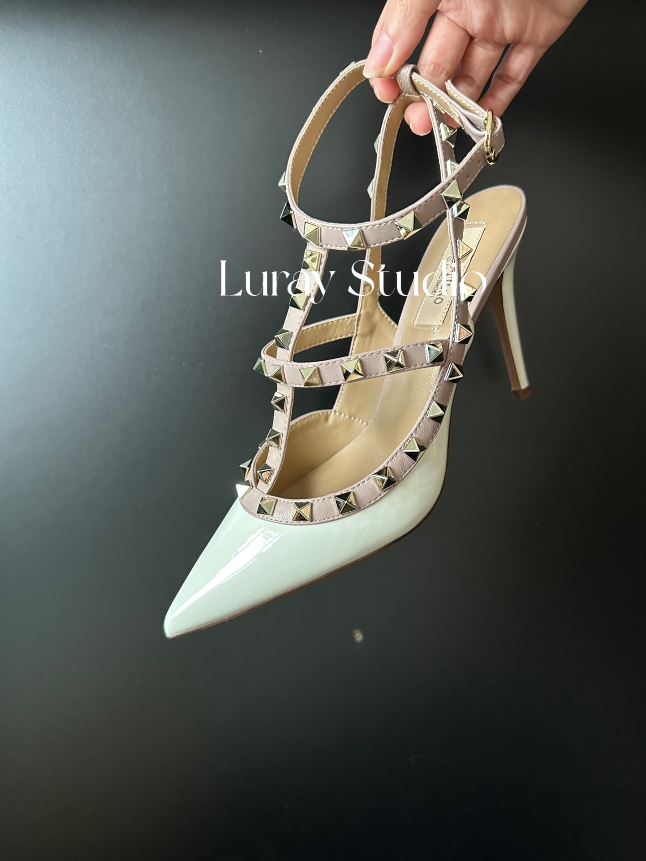 2025夏季新款V家铆钉尖头高跟鞋漆皮网红超火柳钉细跟包头凉鞋女
