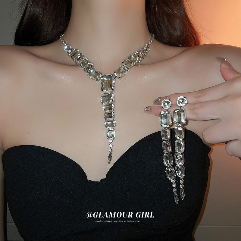 欧美轻奢方形长款流苏耳环项链套装小众复古锁骨链网红夸张饰品女