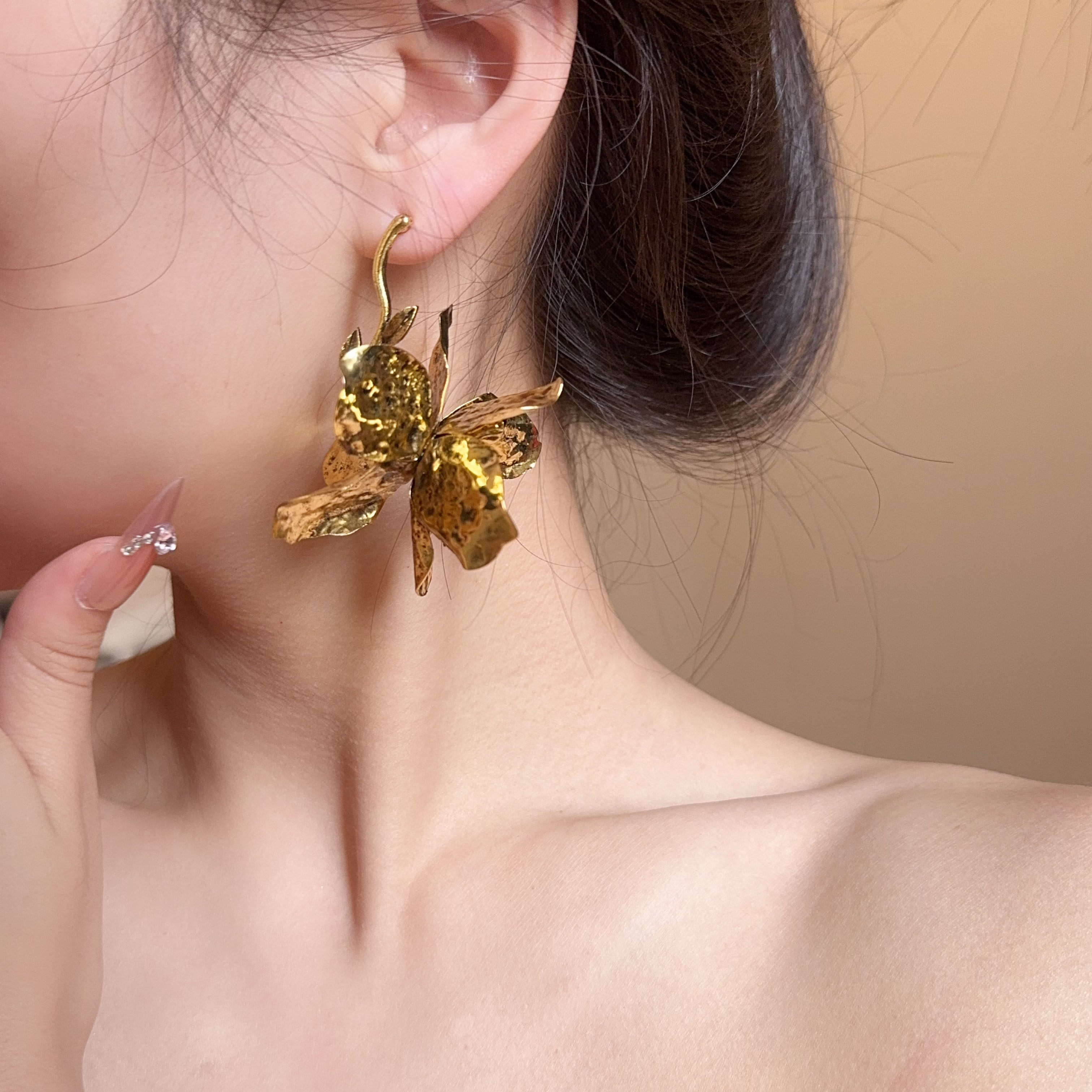 欧美立体花朵夸张金属耳钉2025年新款独特长款耳环复古高级感耳饰