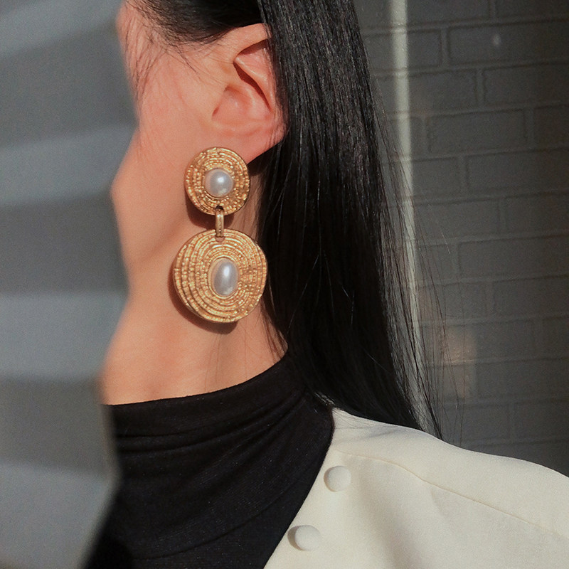 欧美跨境复古圆形耳环气质个性金属纹理夸张耳钉长款简约时尚耳饰
