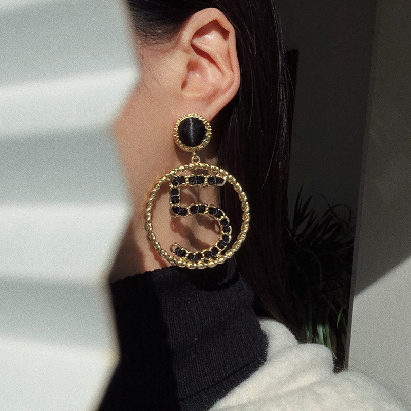 耳边铛335欧美数字5黑色耳环夸张长款几何圆形耳钉复古耳饰耳夹女