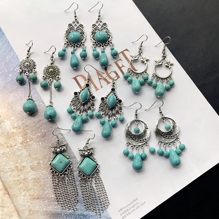 欧美气质复古松石耳环 古银民族风水滴流苏耳坠女百搭长款耳饰品