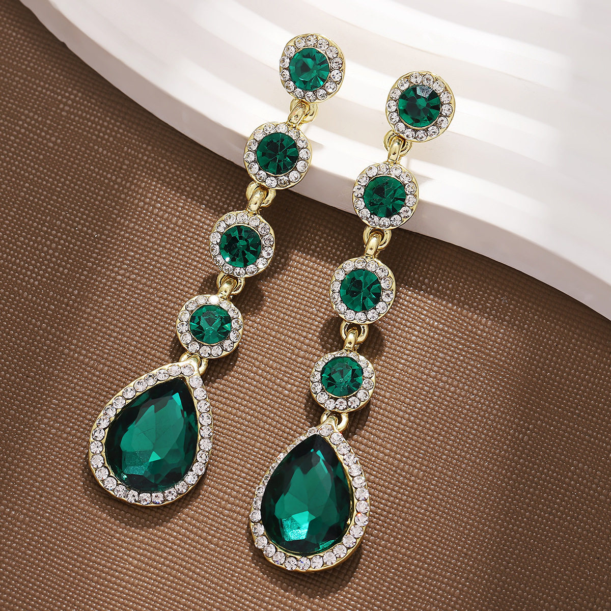 欧美优雅复古祖母绿色宝石耳钉 奢华长款显瘦耳环耳坠 无耳洞耳夹