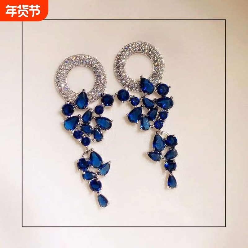 欧美复古蓝色闪钻耳环耳坠女日韩百搭蓝色流苏耳饰品长款流苏耳钉