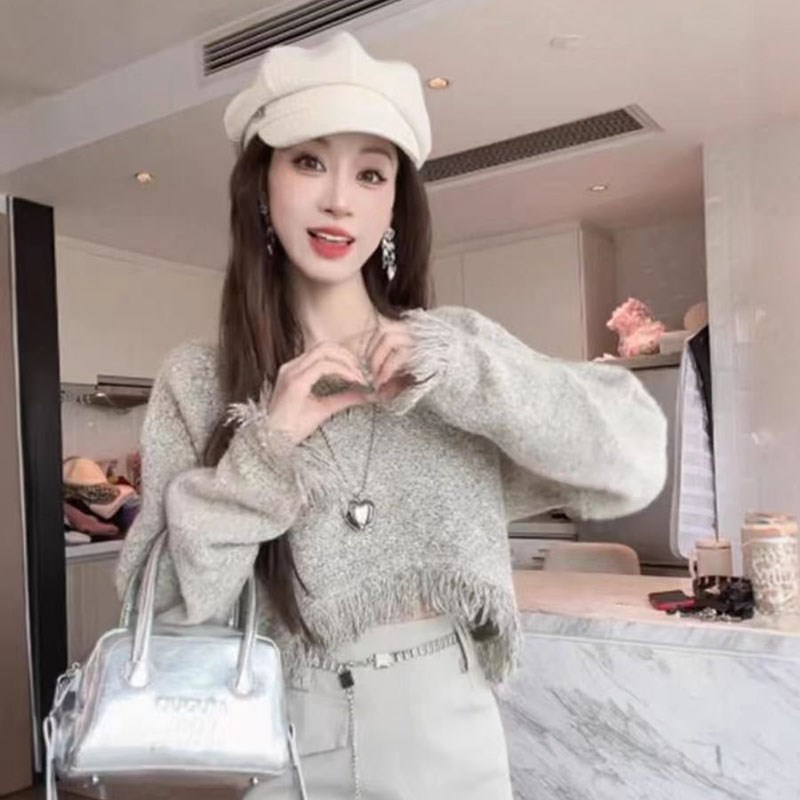 辣妹针织短款上衣女春秋冬新款马海毛高腰不规则流苏一字肩毛衣潮