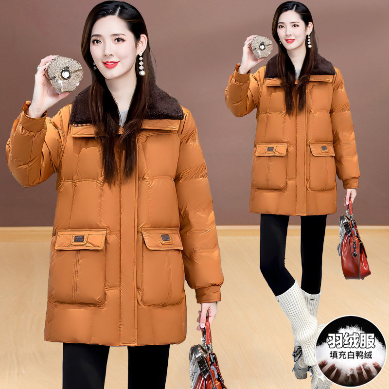 韩版通勤风中长款羽绒服女冬季橘色翻领白鸭绒加厚保暖外套洋气潮