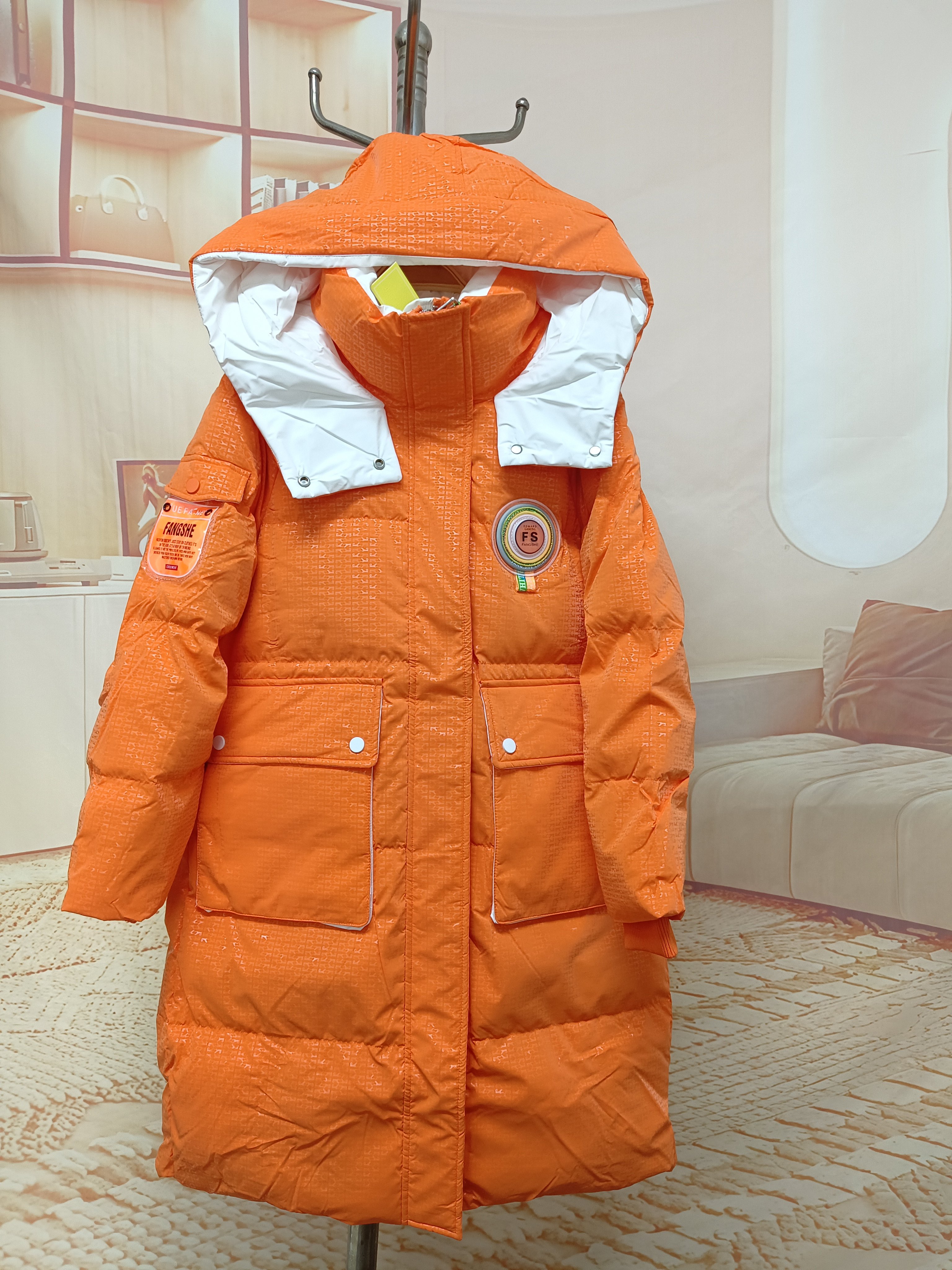 2025羽绒服女橘色白鹅绒长款免洗连帽拼色中长款宽松加厚冬季外套