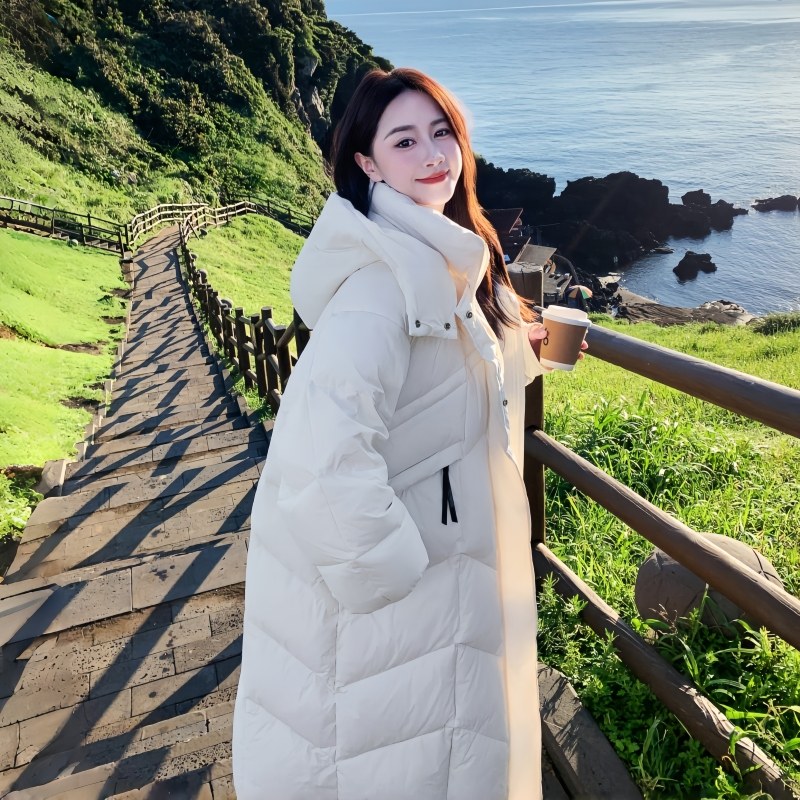 橘色90白鸭绒连帽羽绒服女2026新款韩系宽松长款过膝加厚保暖外套