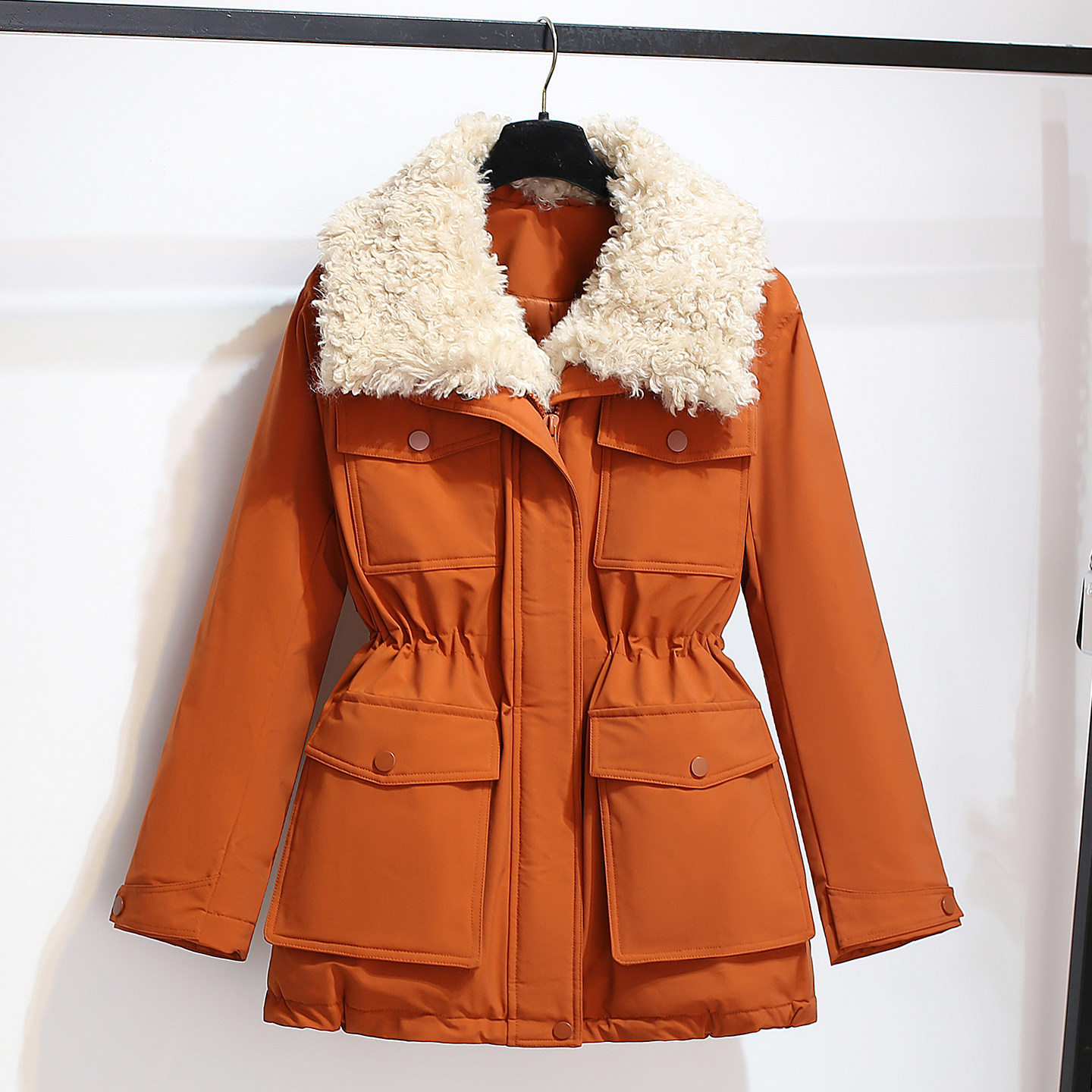 2026冬季新款中长款棉衣洋气羊羔绒大翻领韩版橘色外套羽绒棉服女
