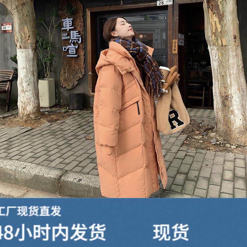 Baulmain Paul橘色长款羽绒服女冬韩版宽松连帽加厚白鸭绒面包服