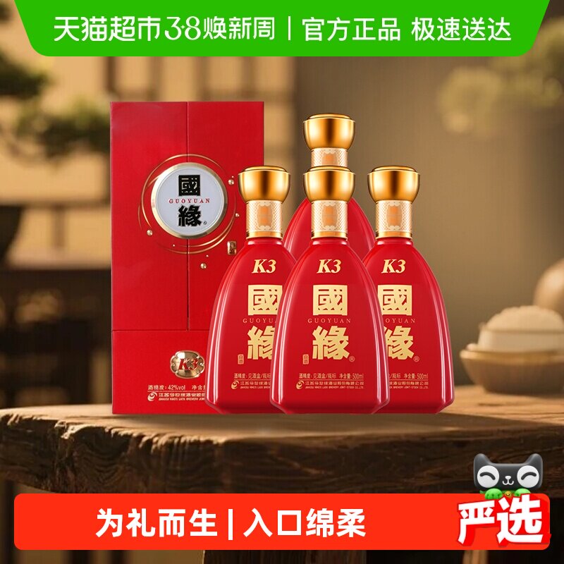 今世缘国缘k3纯粮食白酒整箱特价500ml*4瓶42度柔雅型婚礼宴席酒