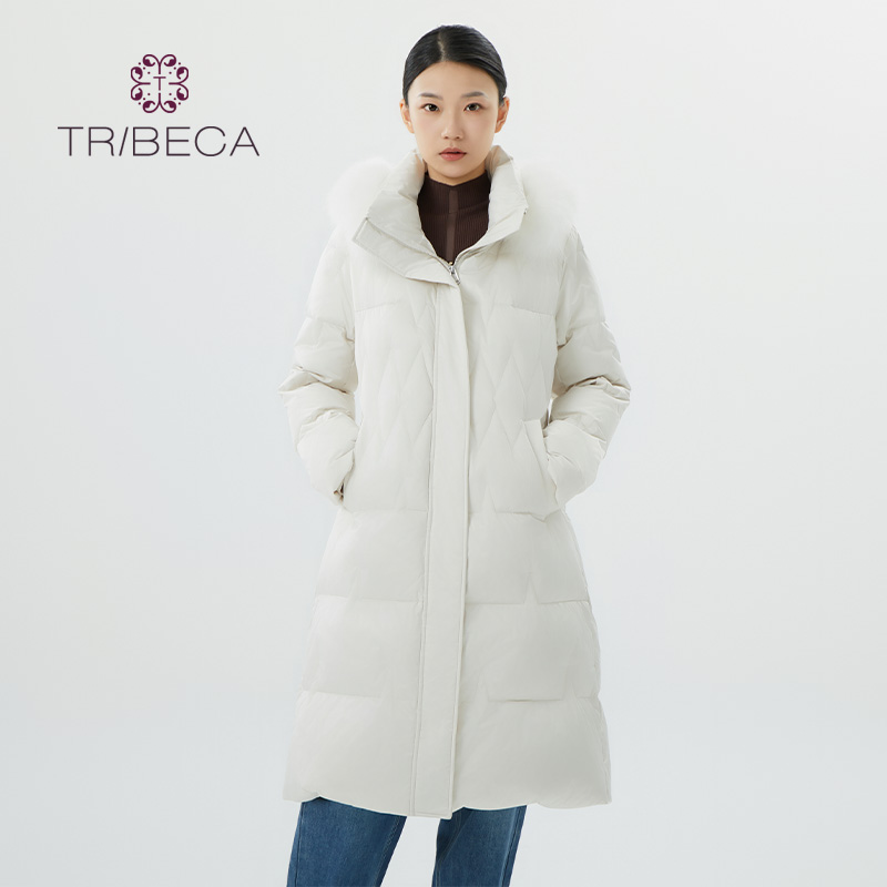 TRIBECA翠贝卡纯色冬季新款商场同款米色长款狐狸毛领羽绒服外套