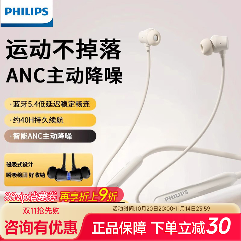 飞利浦运动无线蓝牙耳机挂脖立体高音质超长续航跑步耳机TAN2020