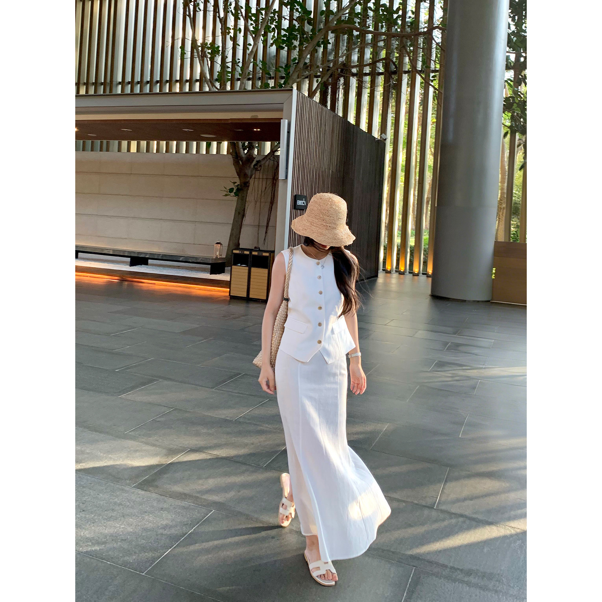 阔色收腰无袖上衣半身裙白色两件套装26春夏季女半裙长裙子背心新