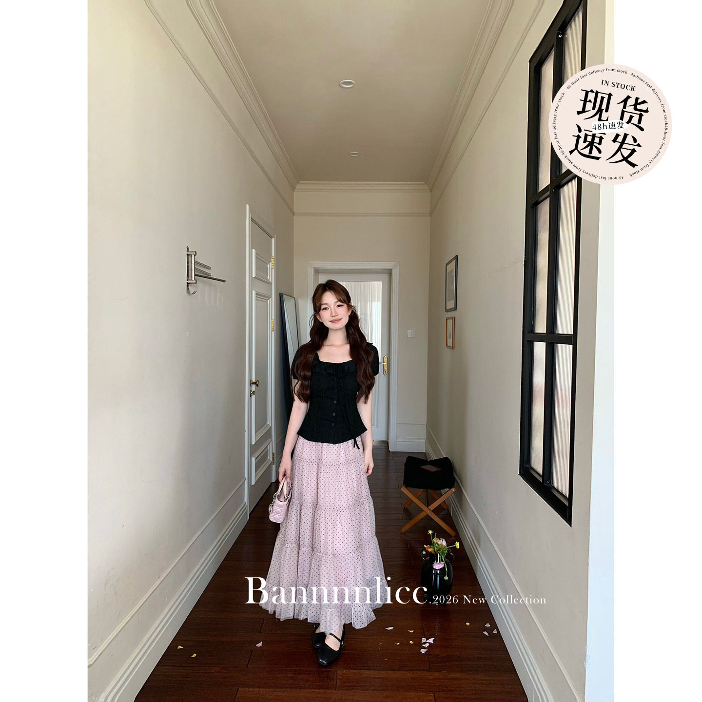 板栗西西【花开仲夏】春夏温柔风黑色收腰上衣粉色半身长裙套装女