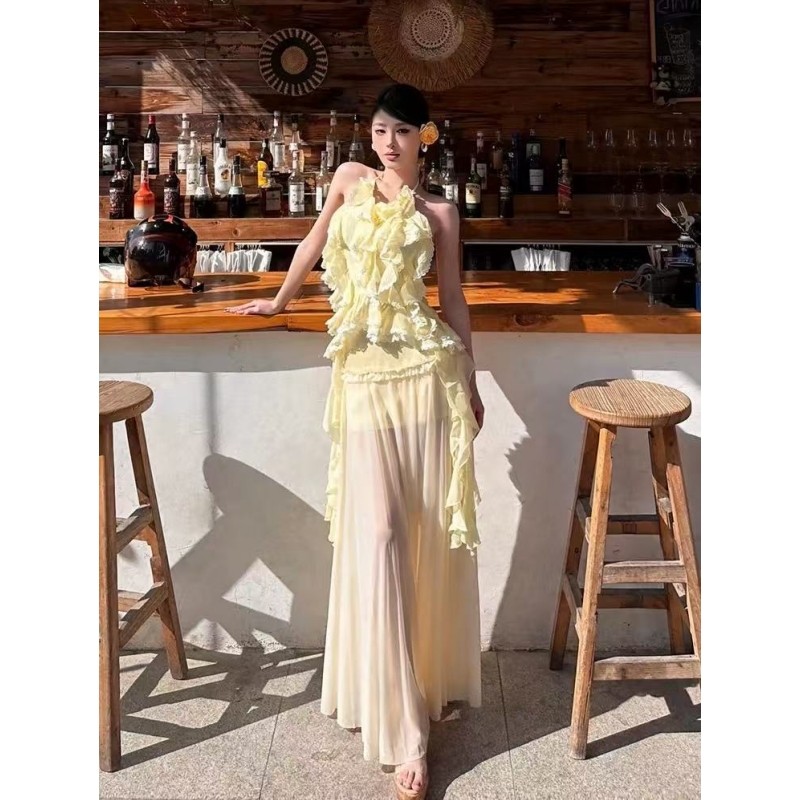 辣妹套装女夏季度假风黄色不规则网纱挂脖上衣长款半身裙海边套装