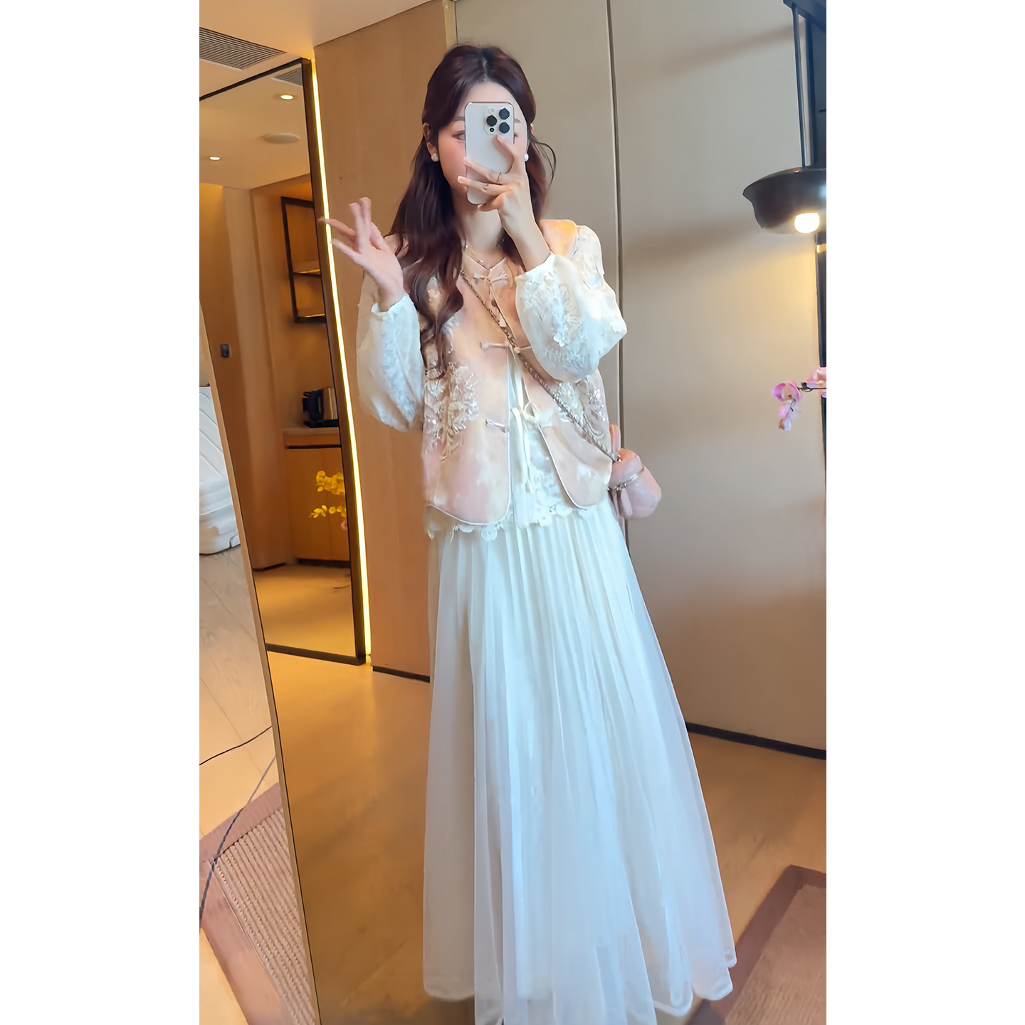 早春漂亮套装高级感网纱刺绣新中式马甲中长款半身裙百搭两件套女