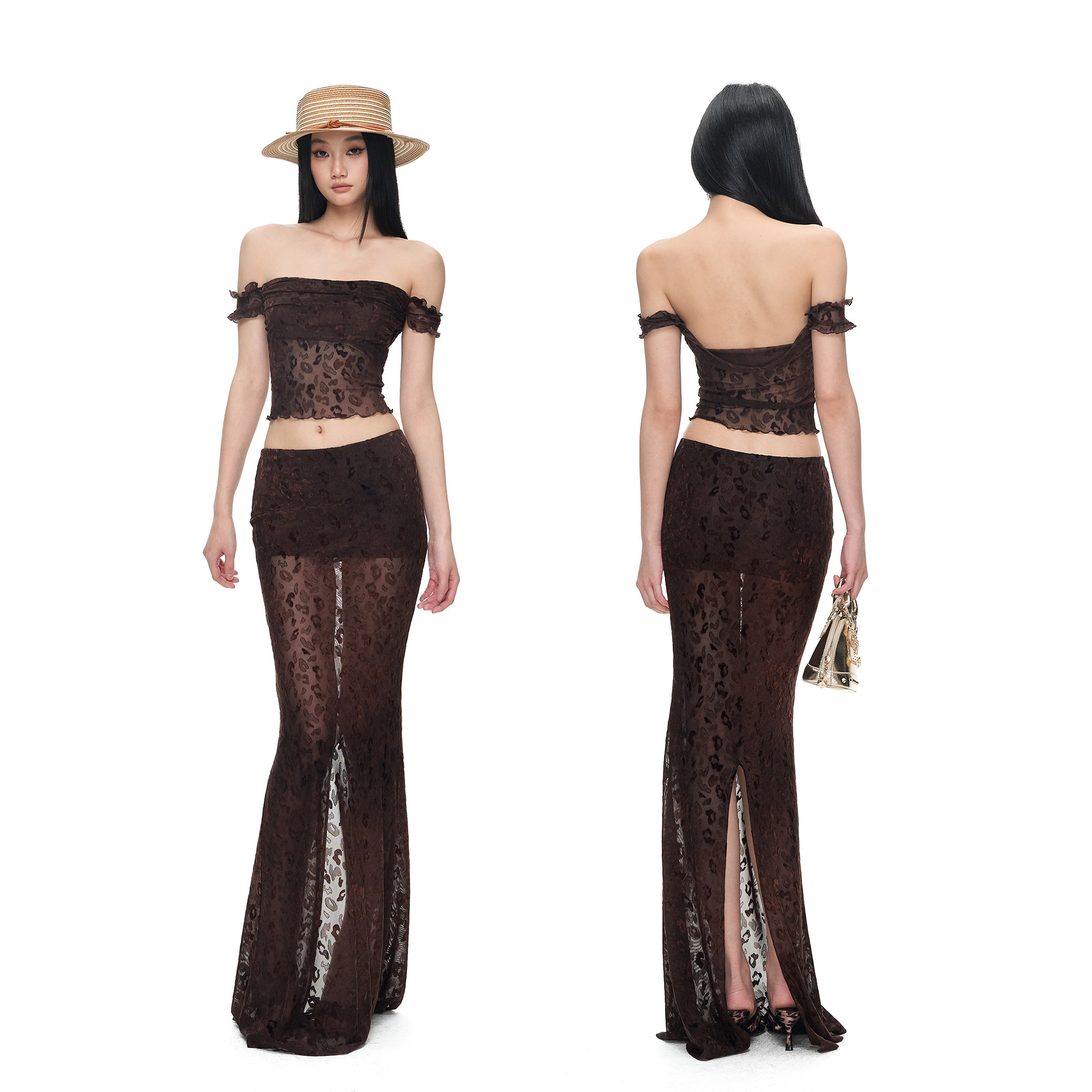 PEMPL 豹纹微透视性感一字肩上衣女低腰修身长款鱼尾半身裙套装