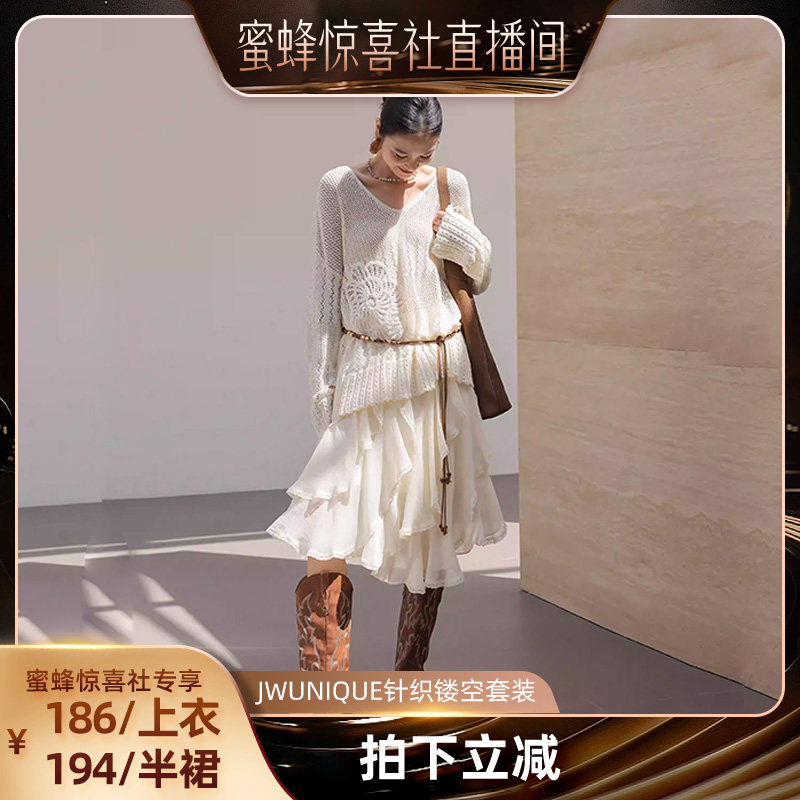 【蜜蜂惊喜社】JWUNIQUE酒窝时尚套装针织镂空上衣半身长裙两件套