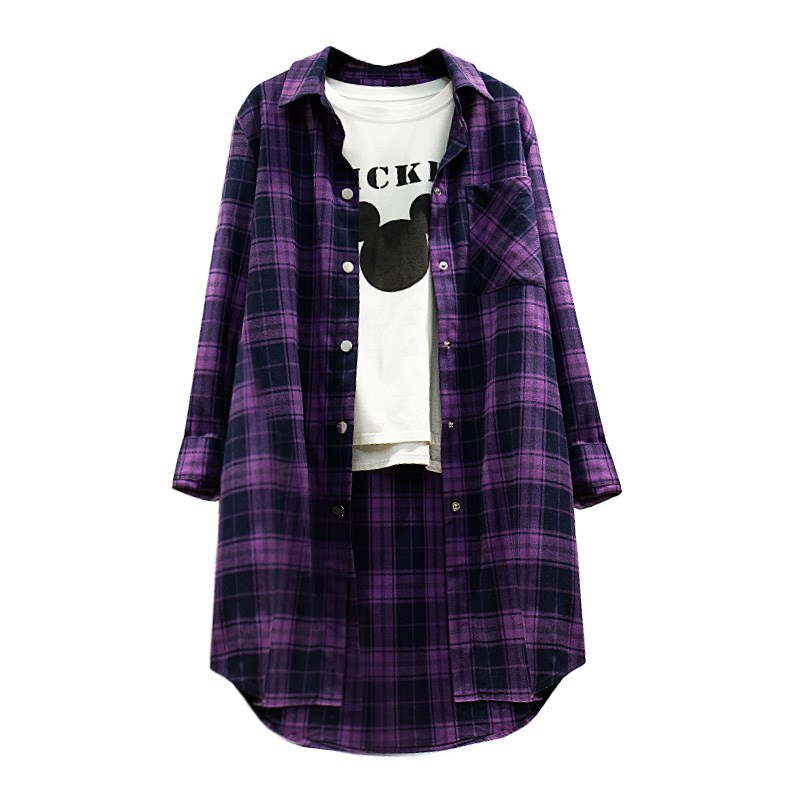紫色格子衬衫女长款中长款春秋外套长袖衬衣纯棉磨毛加厚休闲大码