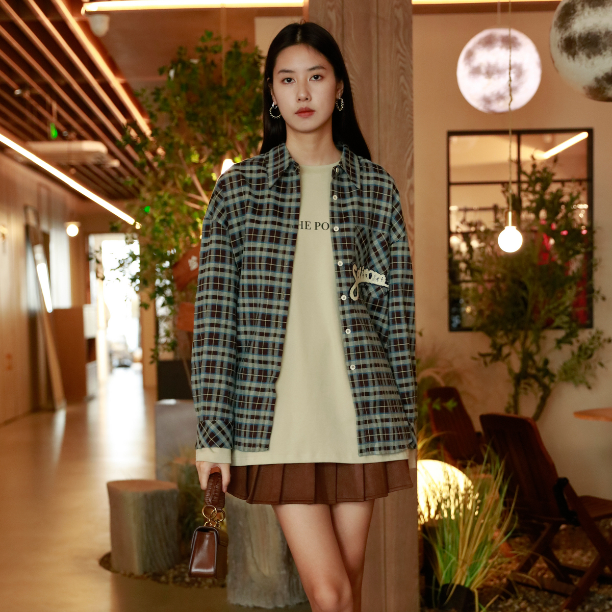 西町村屋衬衫女冬新款宽松简约格纹美式刺绣中长款衬衣HD8103006
