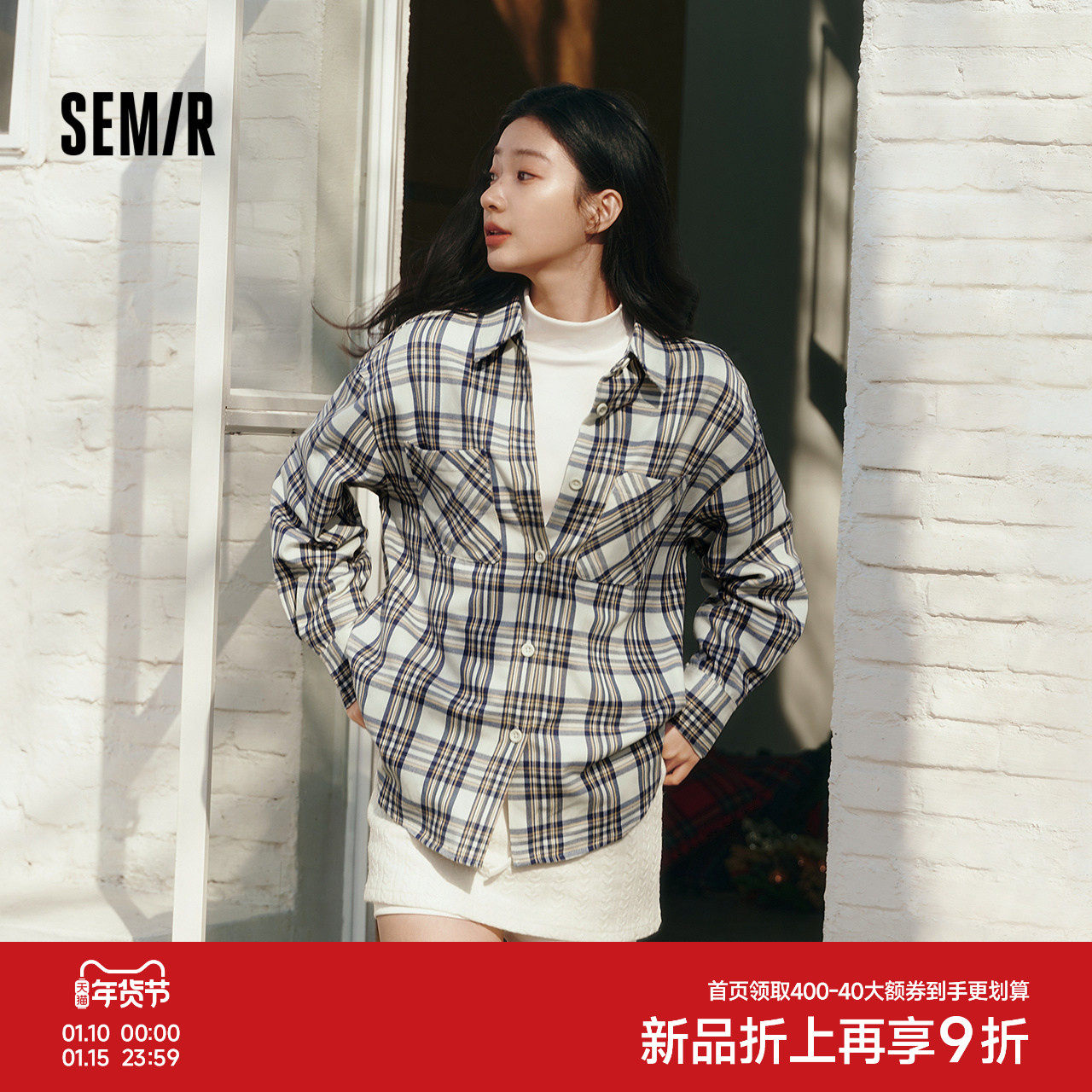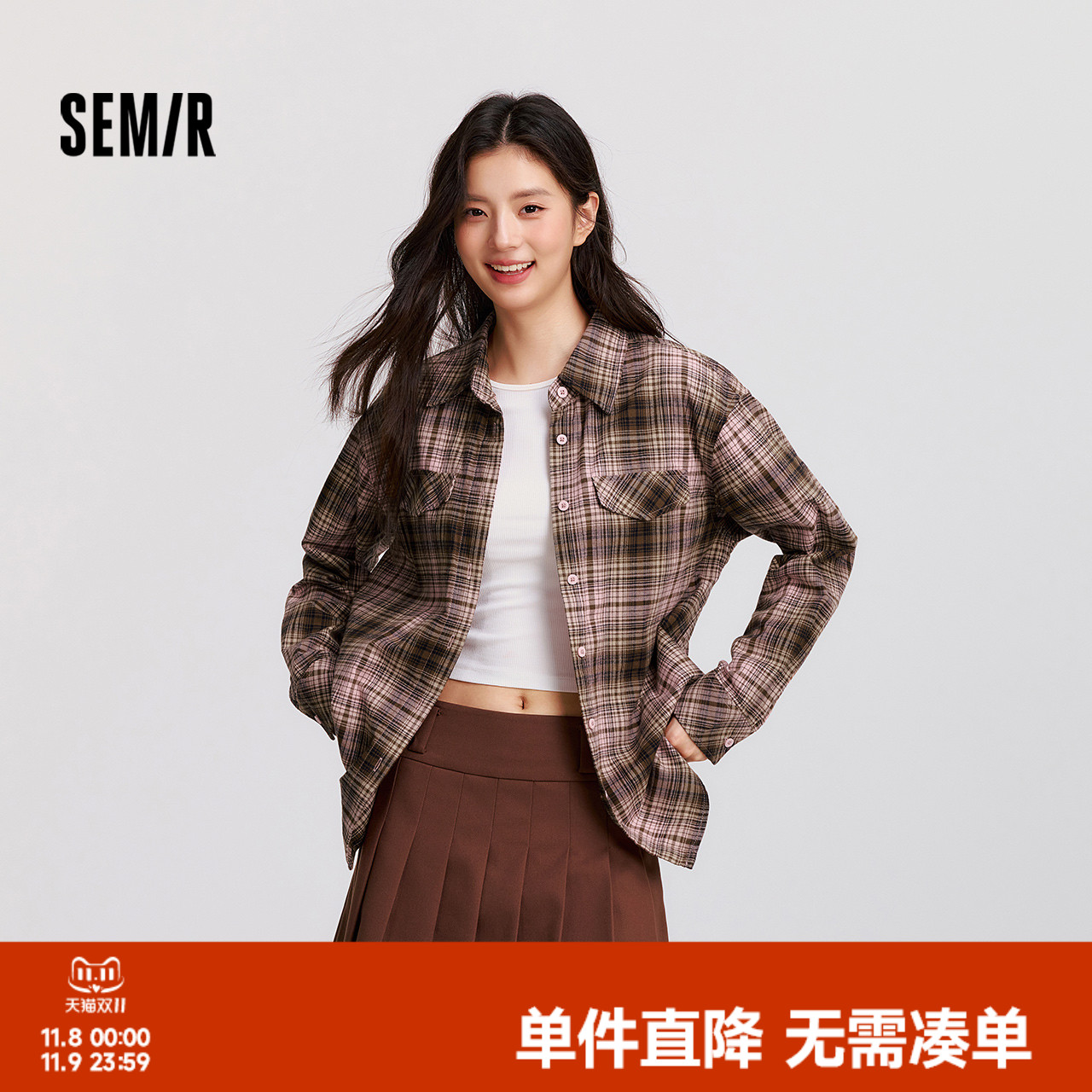 [商场同款]森马长袖衬衫女中长款格子2025秋新款宽松落肩衬衣时尚