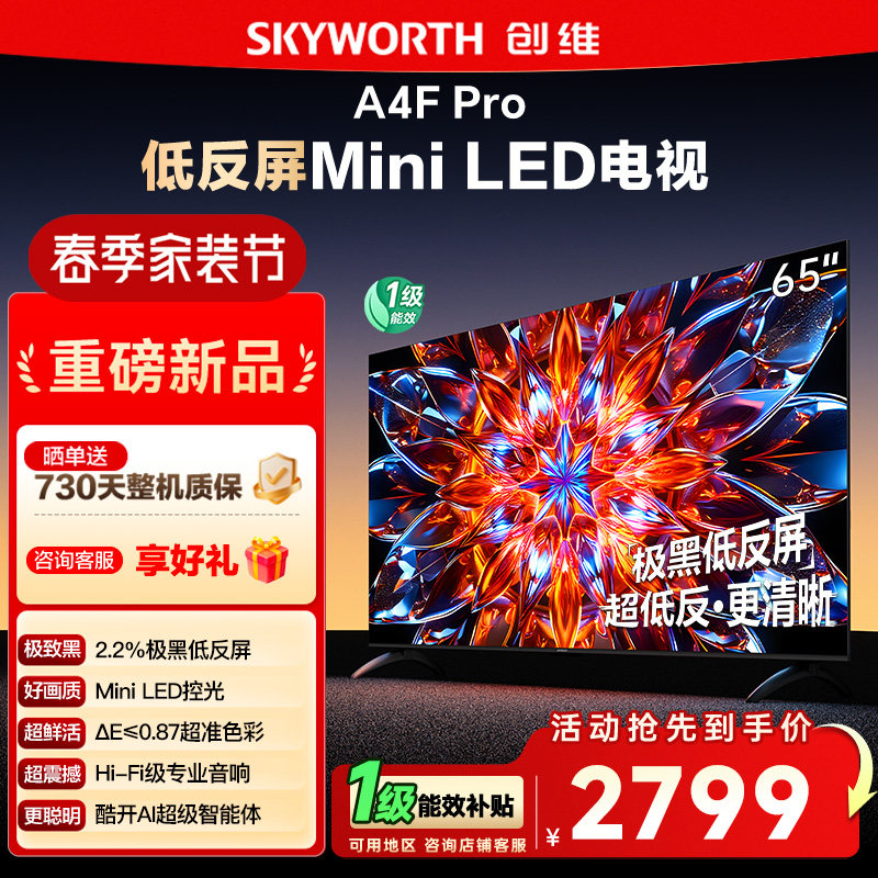 创维A4F Pro 65英寸低反屏Mini LED电视机官方液晶平板 以旧换新