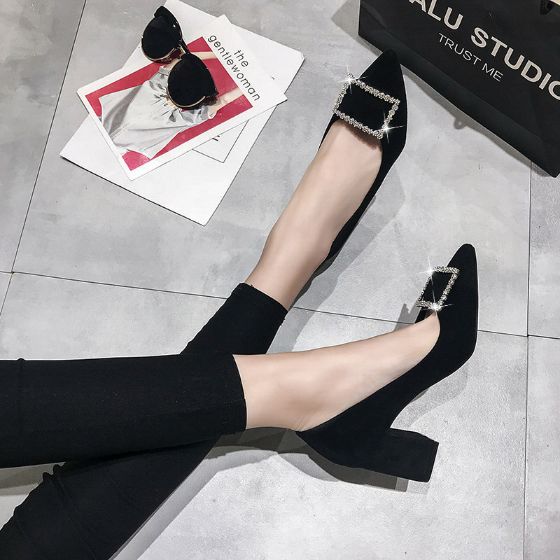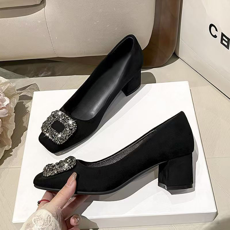 厚黑水钻绒面高跟鞋女方头浅口平底鞋2025年新款通勤粗跟方扣单鞋