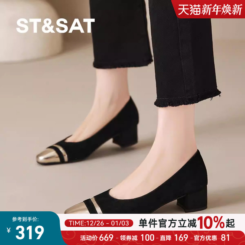 千百度绒面高跟鞋春秋舒适单鞋女通勤粗跟羊皮女鞋浅口晚晚鞋气质