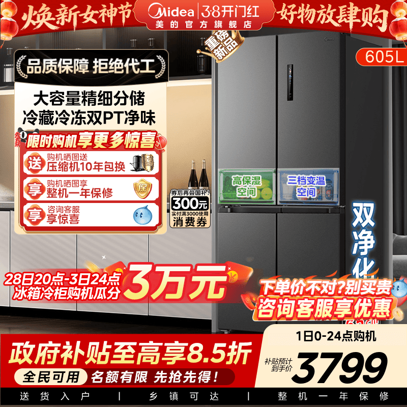 新品美的635大容量风冷无霜十字对开双开门一级变频超薄家用冰箱