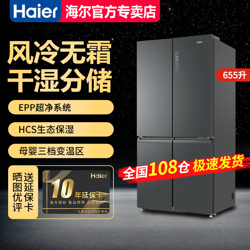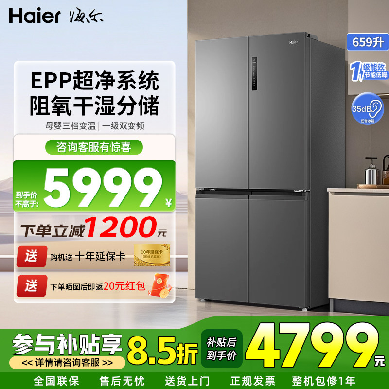 海尔659L十字对开门冰箱家用大容量风冷一级能效双变频干湿分储