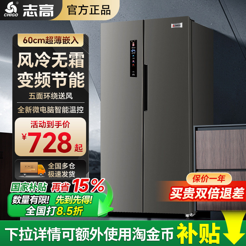 志高对开双开门风冷无霜大容量超薄嵌入式一级节能家用电冰箱十字