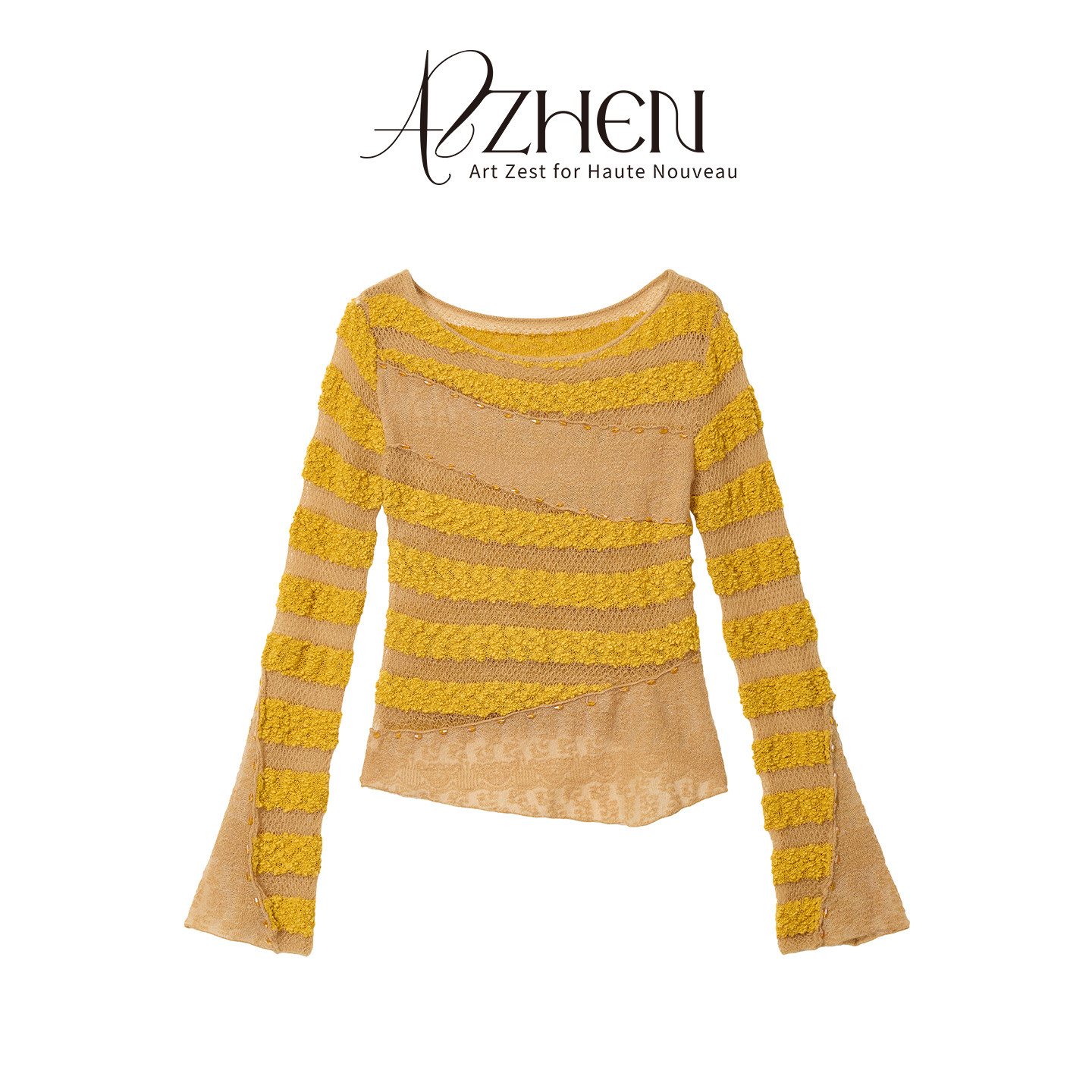 AZZHEN【轻织时光】高级感黄色圆领长袖针织衫女修身毛衣打底衫