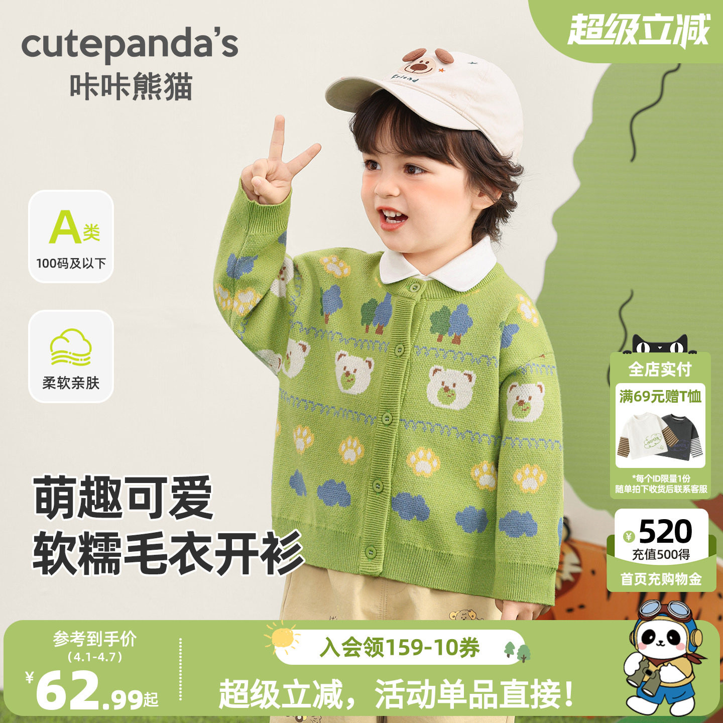 咔咔熊猫儿童外套针织开衫春季男孩宝宝上衣婴儿毛线男童衣服童装