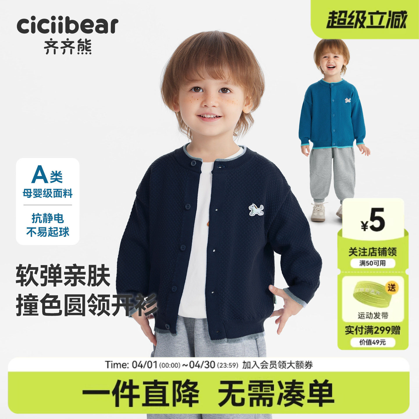 [抗静电起球]齐齐熊男童毛衣春季内搭外穿开衫宝宝毛线上衣针织衫