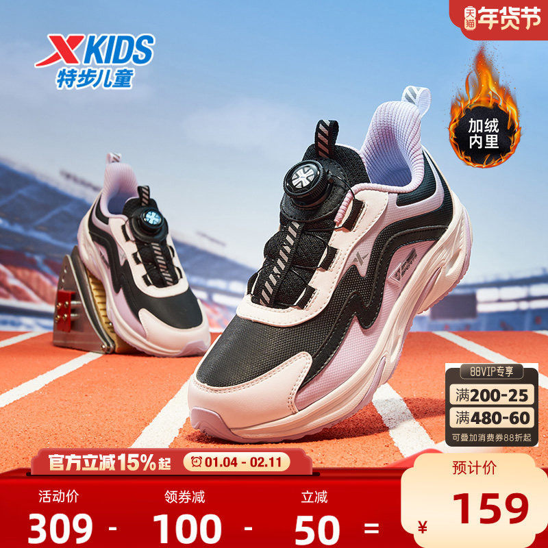 【瞬影】特步童鞋秋季新款儿童运动鞋保暖女童跑步鞋旋转纽扣鞋子