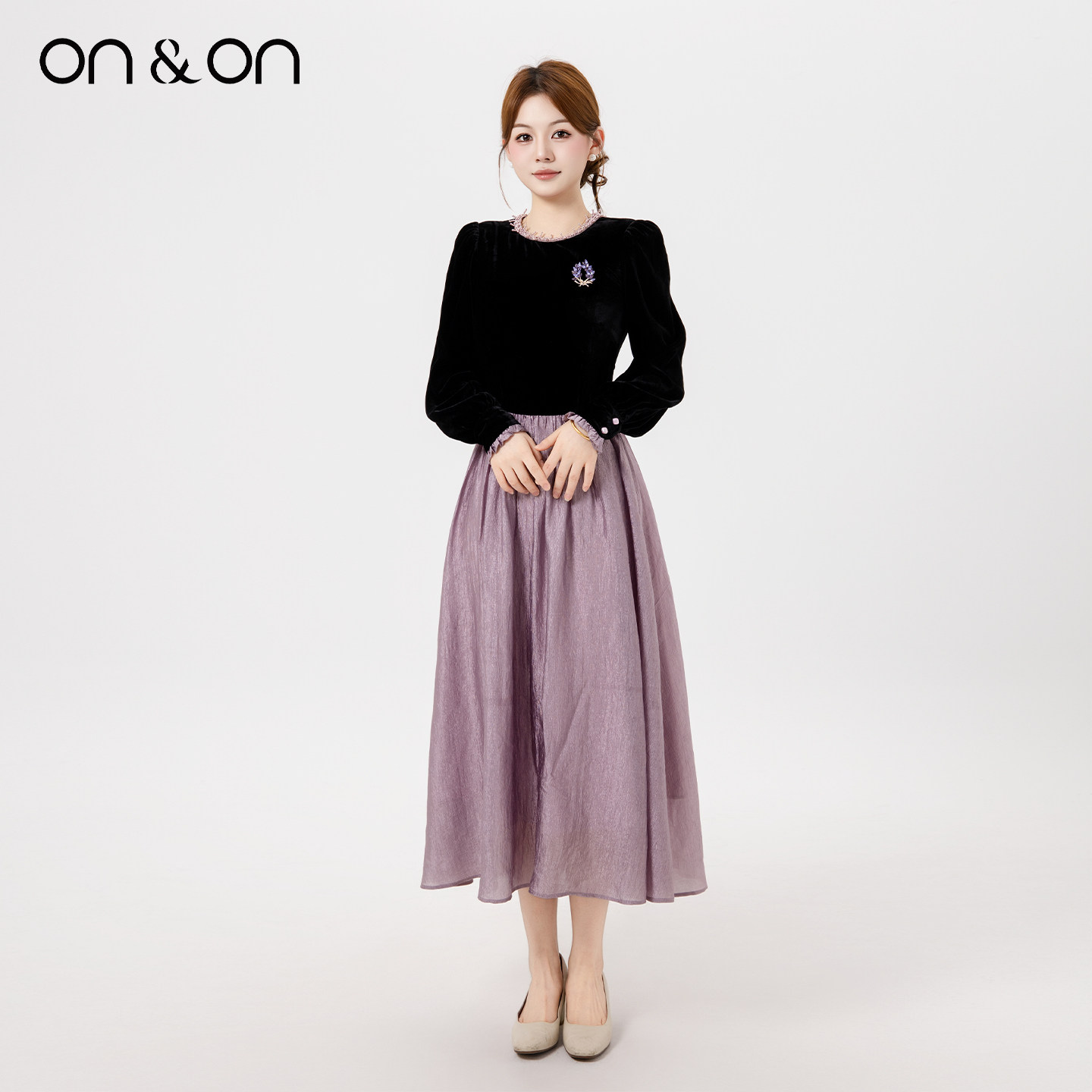 ON&ON/安乃安2025冬季新款法式复古轻奢钉珠拼接撞色加绒连衣裙