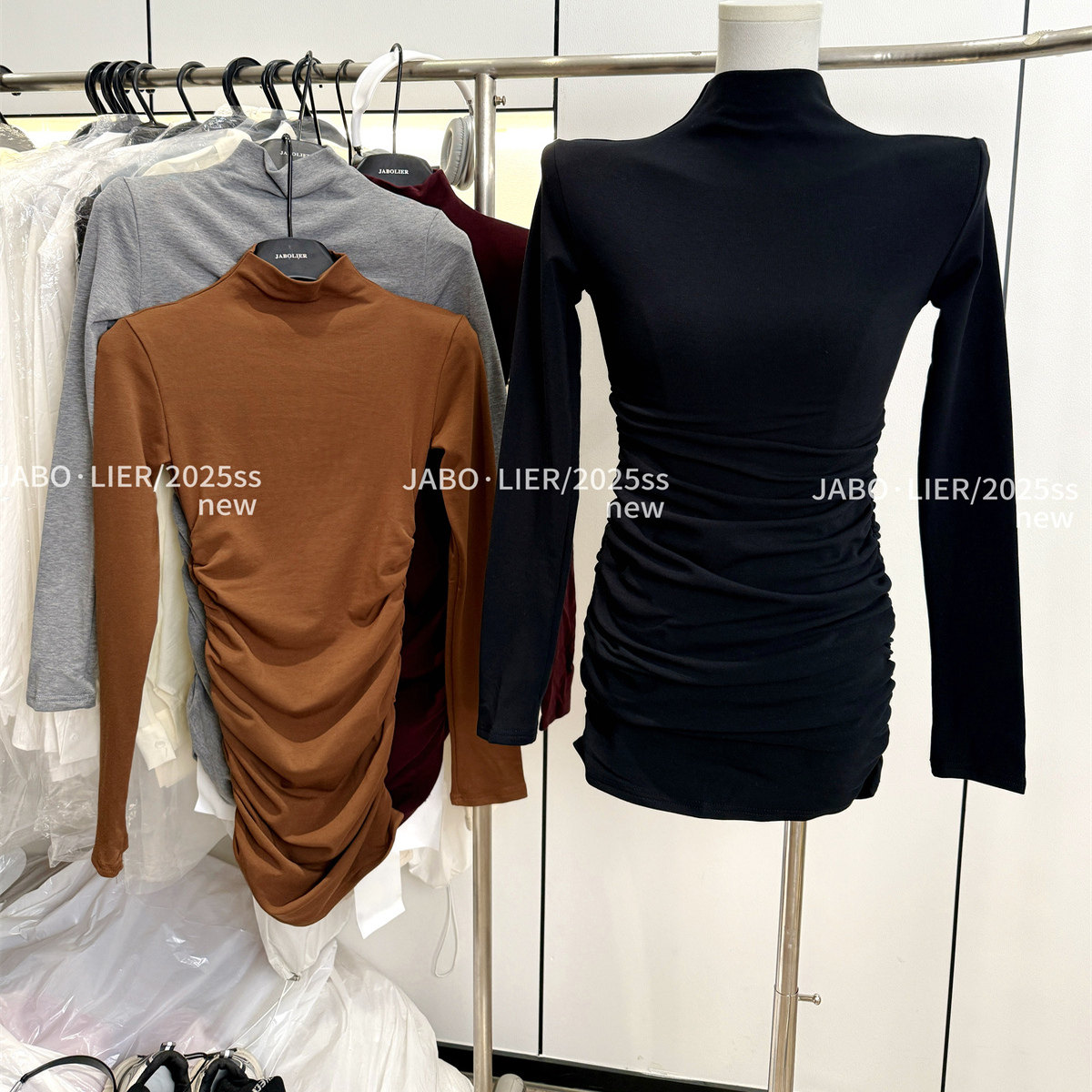 2025年秋冬款半高领内搭气质加绒连衣裙修身显瘦中长款褶皱包臀裙