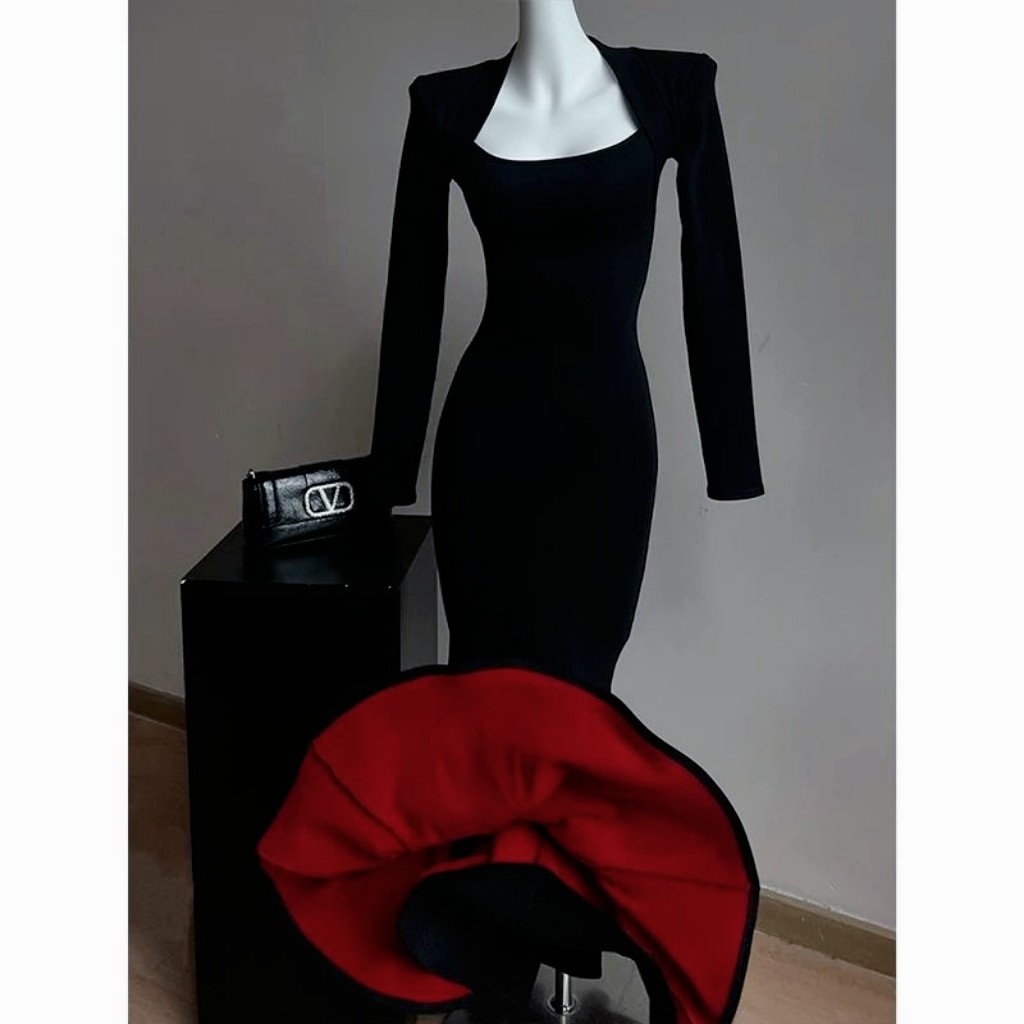 【棉加绒加厚】2025秋冬修身长款连衣裙女收腰显瘦黑色气质长裙