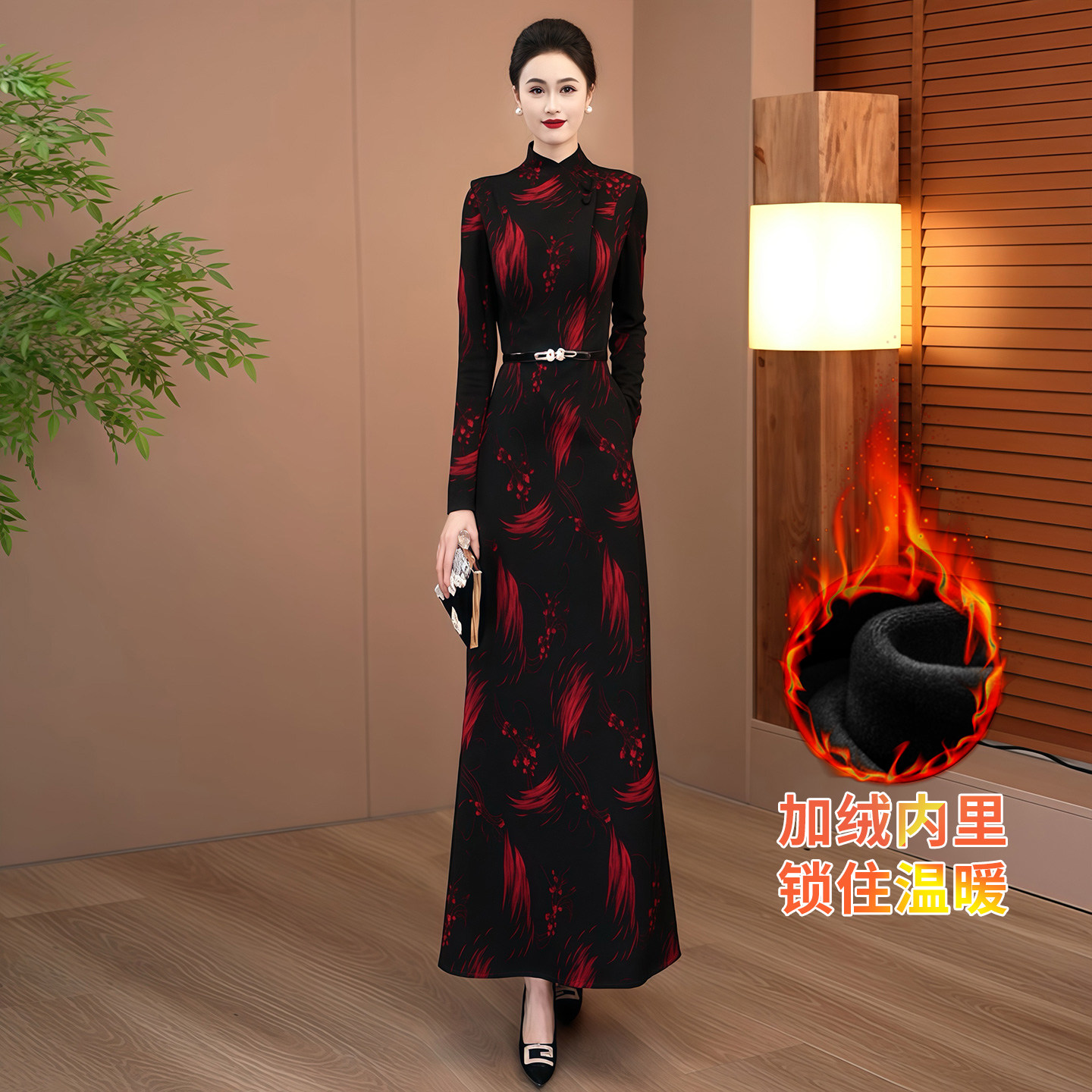 时尚妈妈冬季加绒连衣裙女2025秋冬改良新款长袖洋气复古旗袍裙子