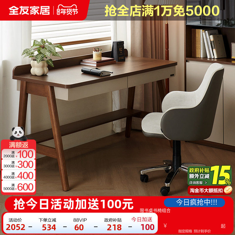 全友家居新中式书桌客厅书房多功能电脑桌子实木腿写字办公工作台