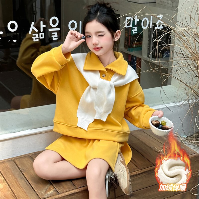 女童加绒卫衣套装2025新款儿童公主衣服女宝宝加厚棉服冬装三件套